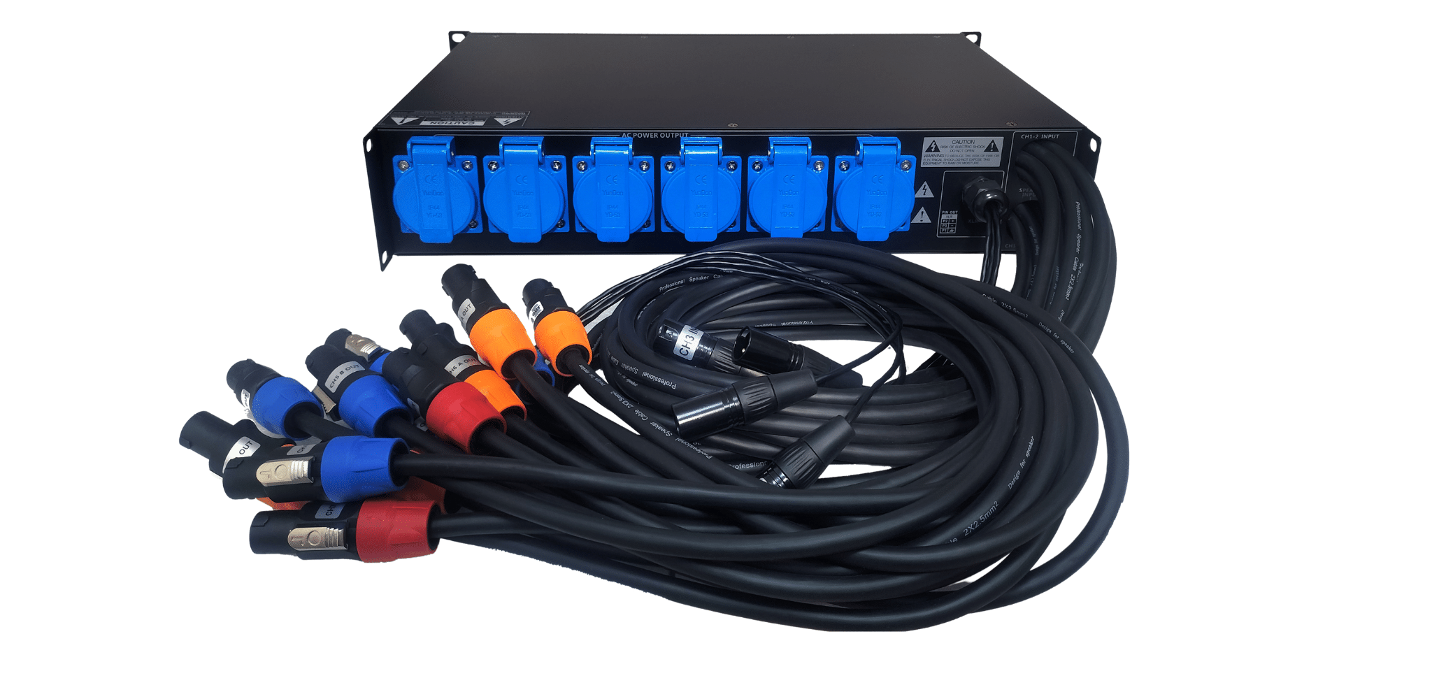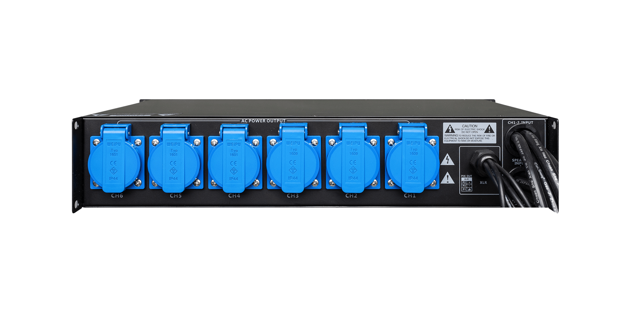 Thiết bị tập trung quản lý nguồn tổng 32A, phân phối ra nhiều nhánh độc lập bằng ổ Weipu 16A chuyên dụng, mỗi nhánh có CB bảo vệ riêng. Cấu trúc tối ưu cho line array giúp chia tải khoa học, giảm sụt áp và hạn chế nhiễu điện. Toàn bộ hệ thống được đặt gọn trong rack 2U, đảm bảo an toàn, thẩm mỹ và dễ kiểm soát.