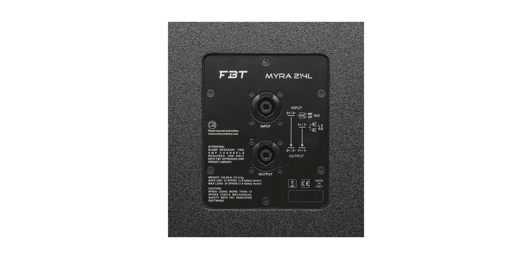 FBT MYRA 214L là loa passive, do đó cần sử dụng ampli công suất ngoài tương thích. Hãy dùng dây Neutrik NLT4MP chất lượng cao để kết nối từ ampli đến loa.
